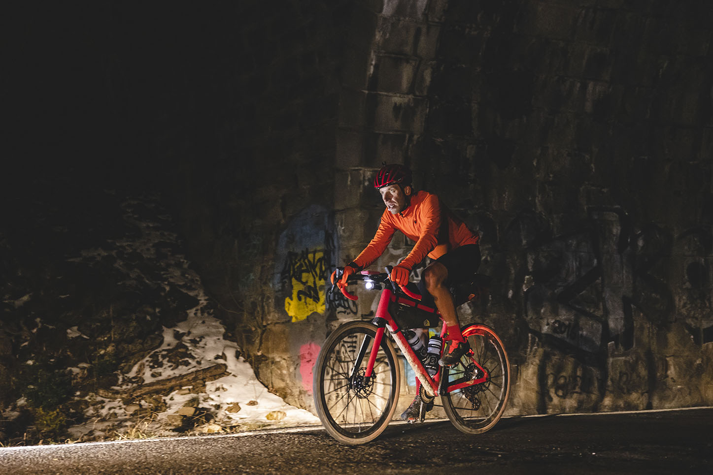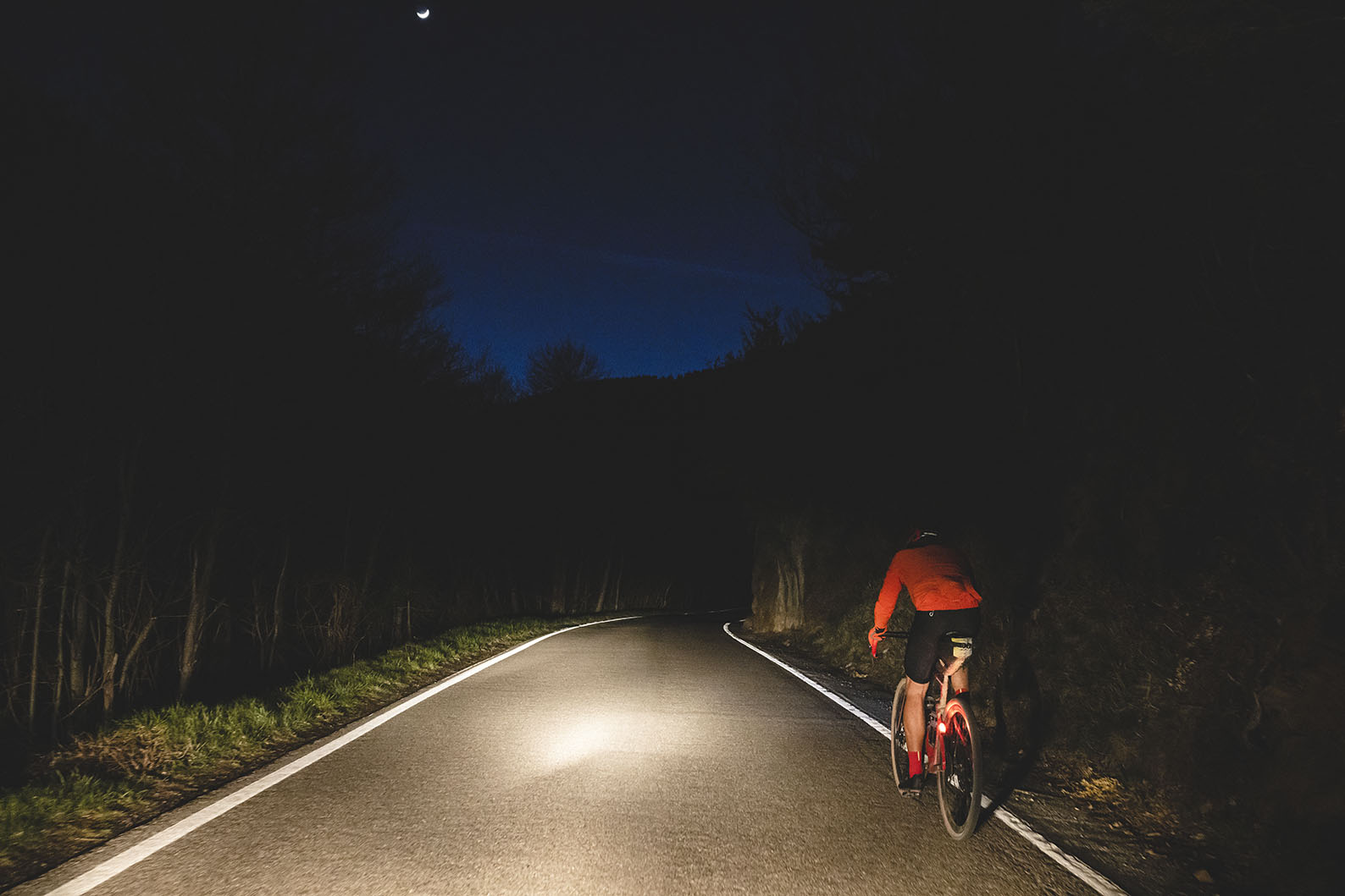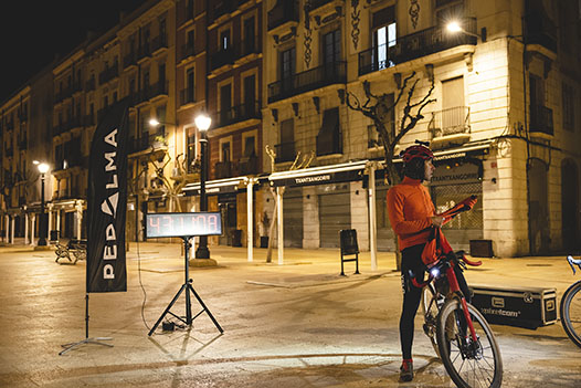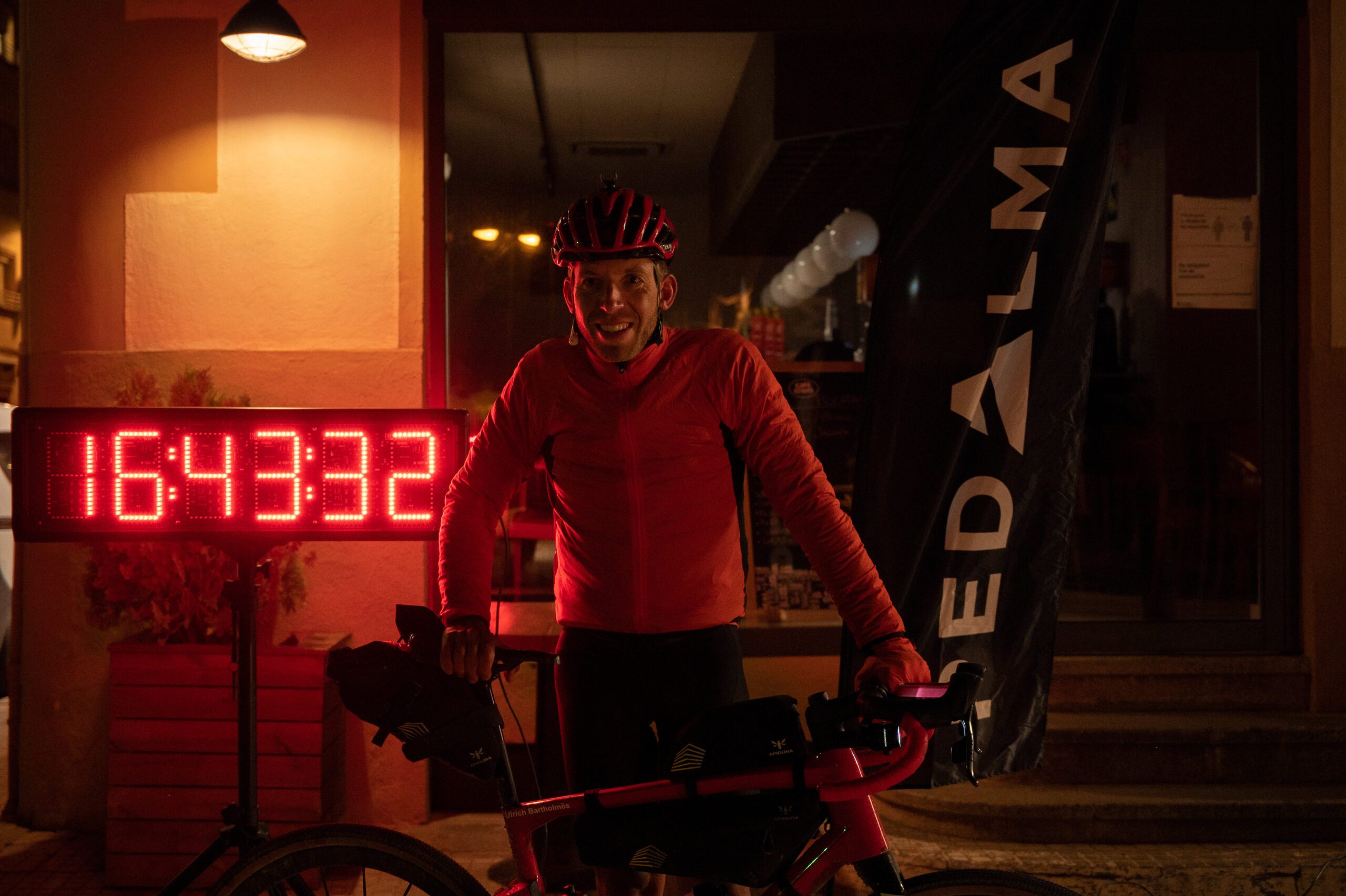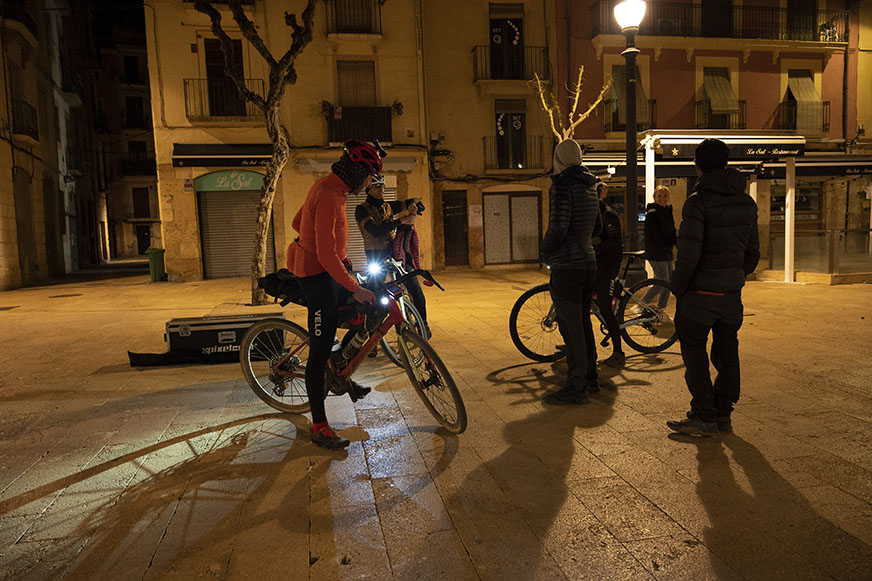 La noche y el cansancio eran los protagonistas en las últimas horas del reto. La cara de Ulrich al lado del pantano de Foix lo decían todo. Son las 4:39 de la madrugada, momento para comer un poco y descansar unos minutos del sillín. Momento de bocadillo. Ulrich mantiene su sonrisa, pero en su cara se aprecia el cambio producido por el esfuerzo.
