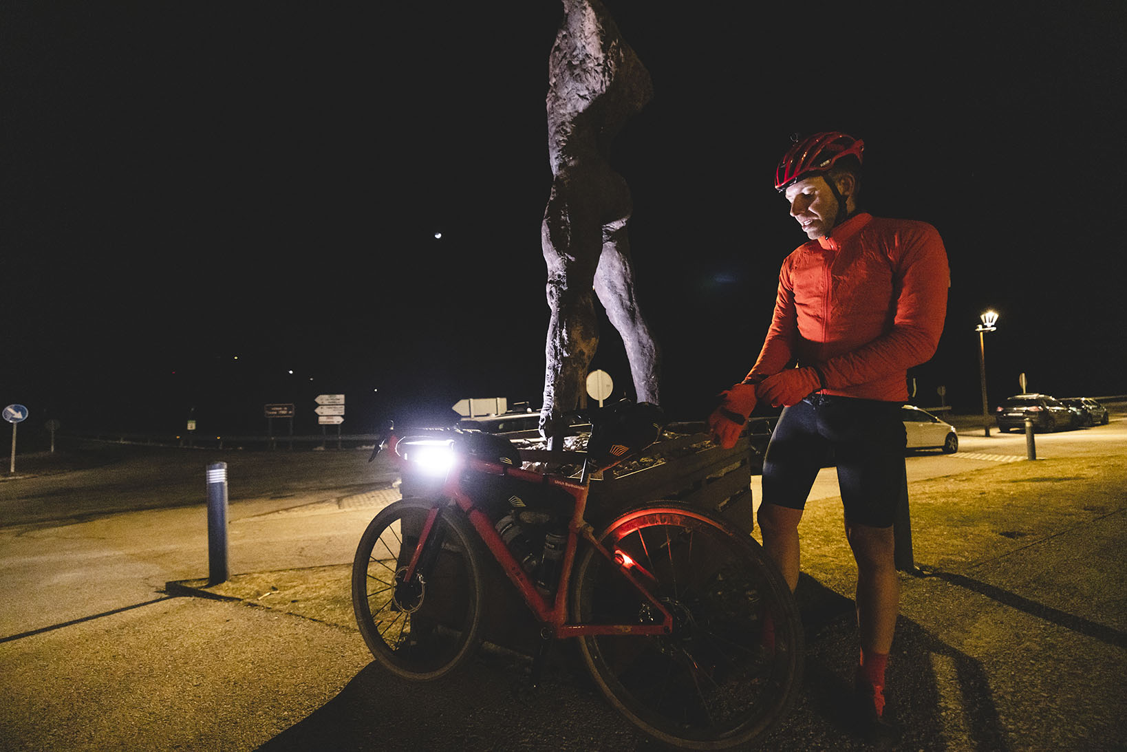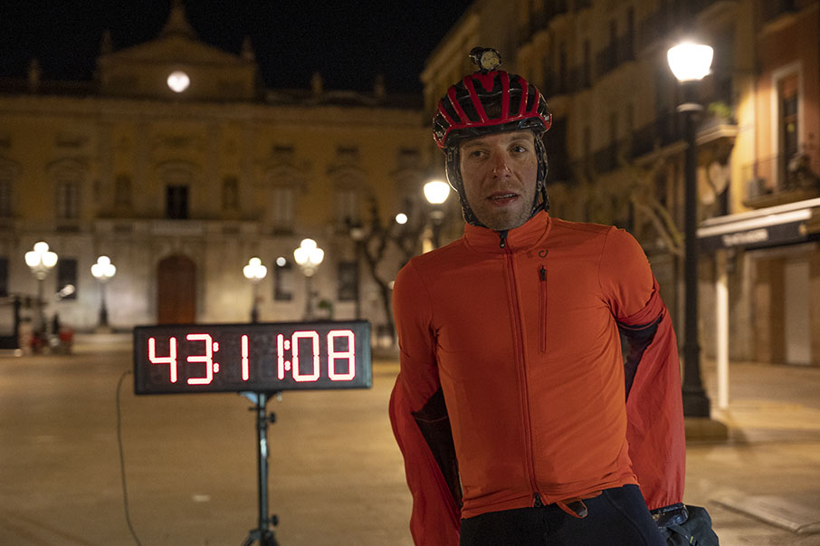 A las 20:49, llega al Albí. Las últimas pedaladas ya se han hecho con luz solar residual. Ulrich para y se equipa de nuevo con su culotte largo. Va a ser una larga noche sobre la bici. Parar a descansar en Tarragona no tiene sentido para él. Así que decide equiparse para liquidar la parte final sin grandes paradas.